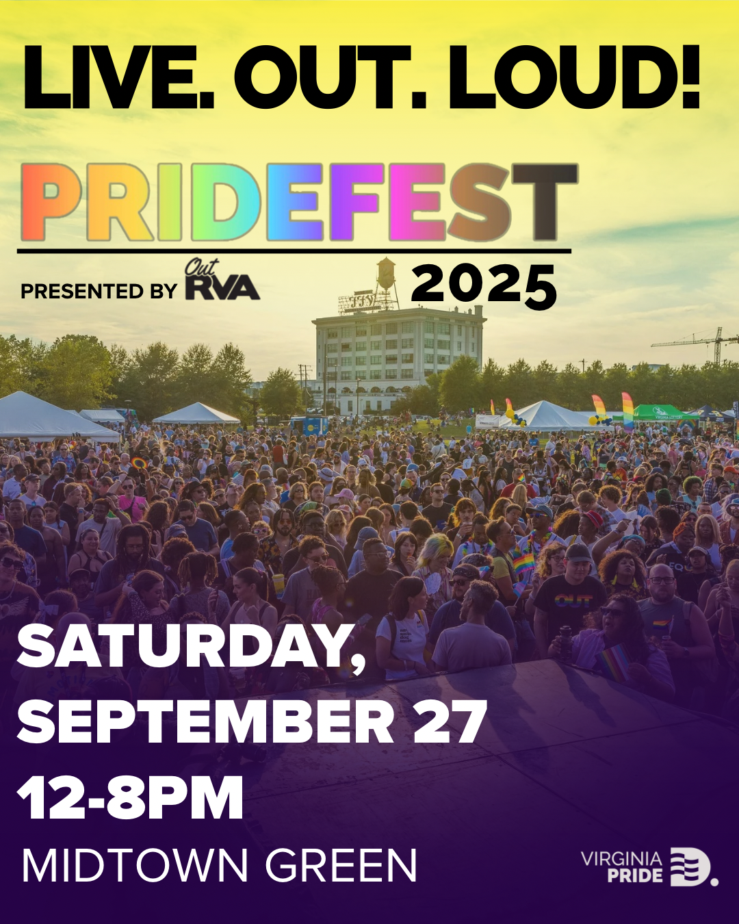 VA Pridefest 2025, presented by OutRVA, is Saturday, September 27 from 12-8pm and we’re excited to welcome thousands of people to celebrate at the Midtown Green at 2401 W. Leigh Street.